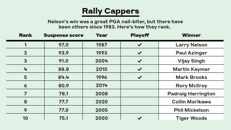 On the flip side, the 1987 PGA was a nail-biter, and the numbers bear that out: The tournament, which was won by future Hall of Famer Larry Nelson, had a suspense score of 97.0, the highest of any PGA I measured. The final round began with a clustered leaderboard, with Nelson, Ray Floyd, Seve Ballesteros and Lanny Wadkins within three shots of the co-leaders, Mark McCumber and D.A. Weibring. And it remained a crowded horse race throughout the day. With four holes to play, Nelson and Scott Hoch were tied for the lead, and three others were within two strokes. Nelson and Wadkins wound up in a playoff, which Nelson won for this third major title.