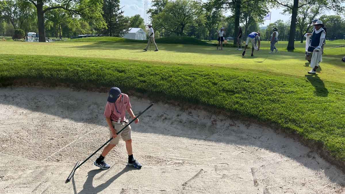 That’s my 12-year-old son Declan in the foreground, tending to a bunker at Upper Montclair (N.J.) CC, on the occasion of the LPGA’s Founders Cup pro-am, which I was lucky enough to play in. I brought Declan along to loop for me. This photo makes me smile because, as if trying to execute proper raking technique in this environment isn’t a big enough ask, my kid, in this moment, also had the watchful eyes of a pro caddie on him. No pressure, kid! Good news was, his raking was way better than my shot-making. Low bar but still… — Alan Bastable