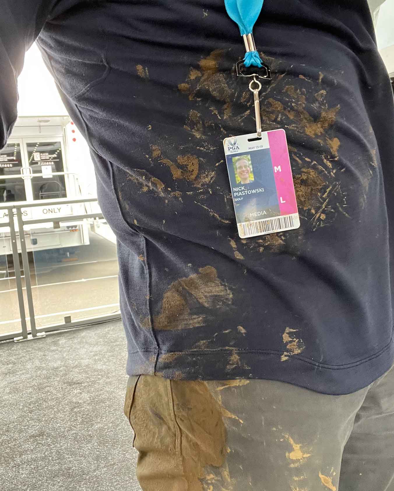 The Valhalla hill looked muddy, but climabl … oh, who was I kidding, it looked slippery. But at the PGA Championship back in May, I was following a group of players and needed to keep up, so I stepped — and slid in front of dozens of folks, their oohs blocking out the sound of my turf contact. But I was OK. I’d braced myself and bounced back up, though I was left with a nice dirt streak along the right side of my body, as you can see. Made for some odd looks at the press conferences. — Nick Piastowski