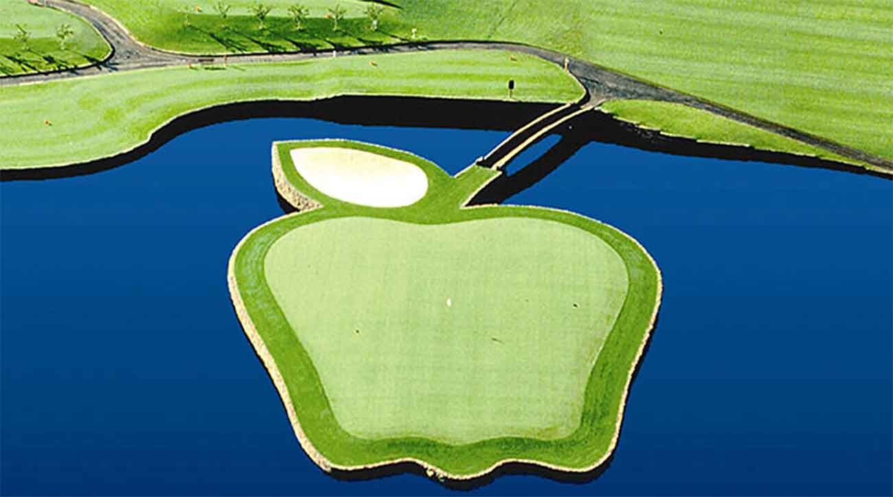 Winding its way through a Washington Delicious apple orchard, this aptly named layout waits until the 17th to reveal the best of the bunch. This sweet one-shotter plays to an apple-shaped green guarded back-left by a bunker that resembles a leaf. The entire green complex connects to dry land via a stem in the form of a 50-foot walk bridge.