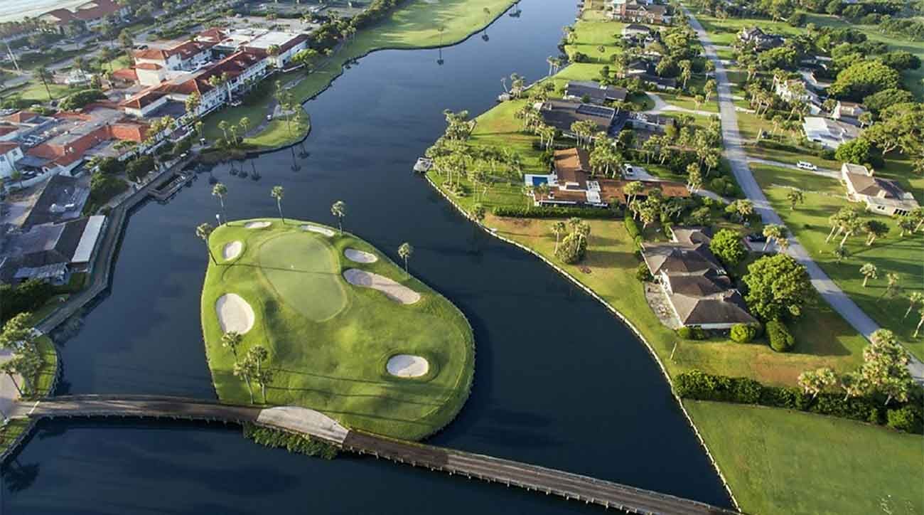 Jack Nicklaus apprenticed as an architect with Pete Dye, so it’s no surprise that he popped out a few island greens of his own, including this early version (1986), which features tongues of turf protruding into the water front and left, and a trio of bunkers right and back.