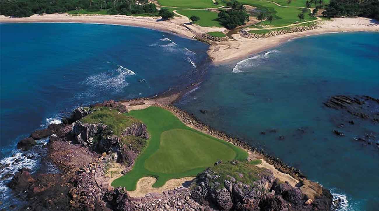 This optional par three, known as “Tail of the Whale,” scores points for not only its jaw-dropping views of the Sierra Madre Mountains, but also its unique element of adventure. After striking their tee shots onto dry land, golfers travel to and from the green via dinghy. It claims to be the only island green in the world where the Pacific Ocean functions as the water hazard.