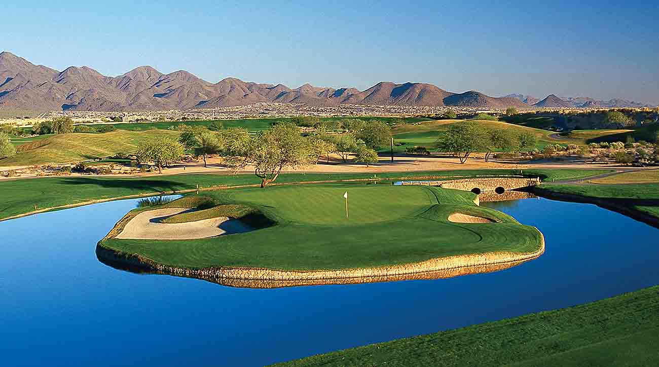 Pete Dye was skeptical about replicating his Sawgrass island green in the desert, but colleagues, the developers and PGA Tour Commissioner Deane Beman convinced him otherwise. Backdropped by mountains, the hole differs from its Florida cousin in that it’s lined with rocks, rather than railroad ties, it’s longer by 30 yards and its green is significantly larger.