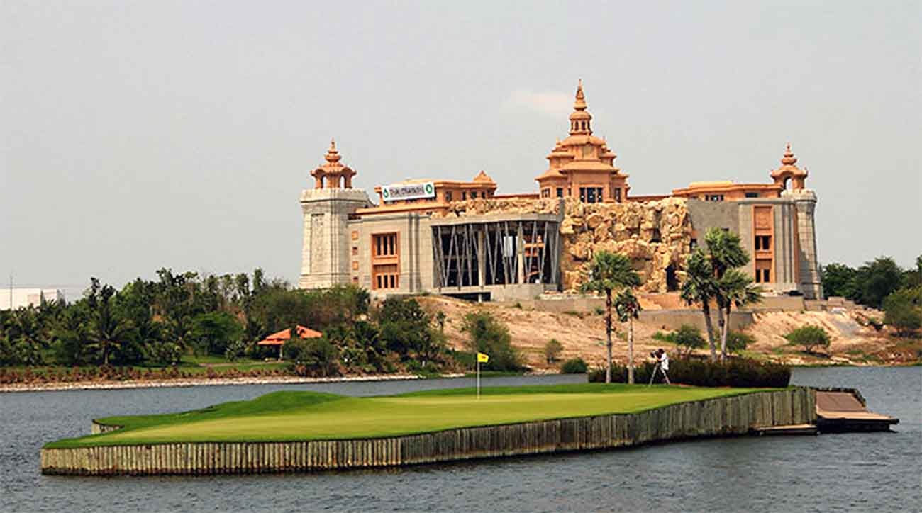Asia’s first floating island green is the product of the Lee Schmidt-Brian Curley design team, both of whom once worked for Pete Dye. Fortunately, Sergio Garcia handled this hole better in winning the 2013 Thailand Golf Championship than he did the TPC Sawgrass version that same year, when he splashed twice in an unsuccessful bit to beat Tiger Woods.