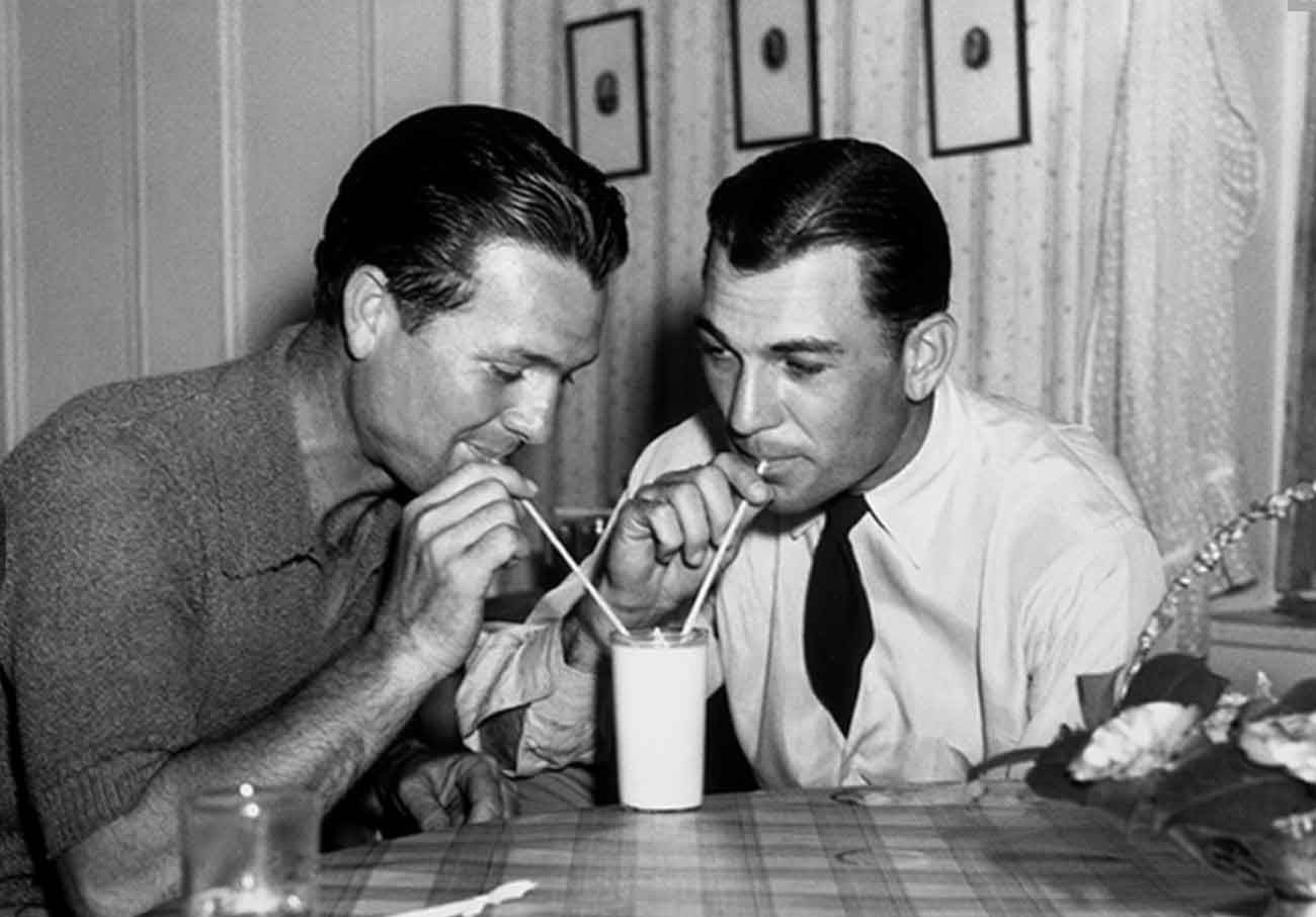 A black-and-white photograph of Jimmy Demaret and Ben Hogan sharing a glass of milk in 1940 in the Augusta National Clubhouse. Demaret won titles in 1940, 1947 and 1950, becoming the tournament’s first three-time winner. Hogan won in 1951 and 1953.