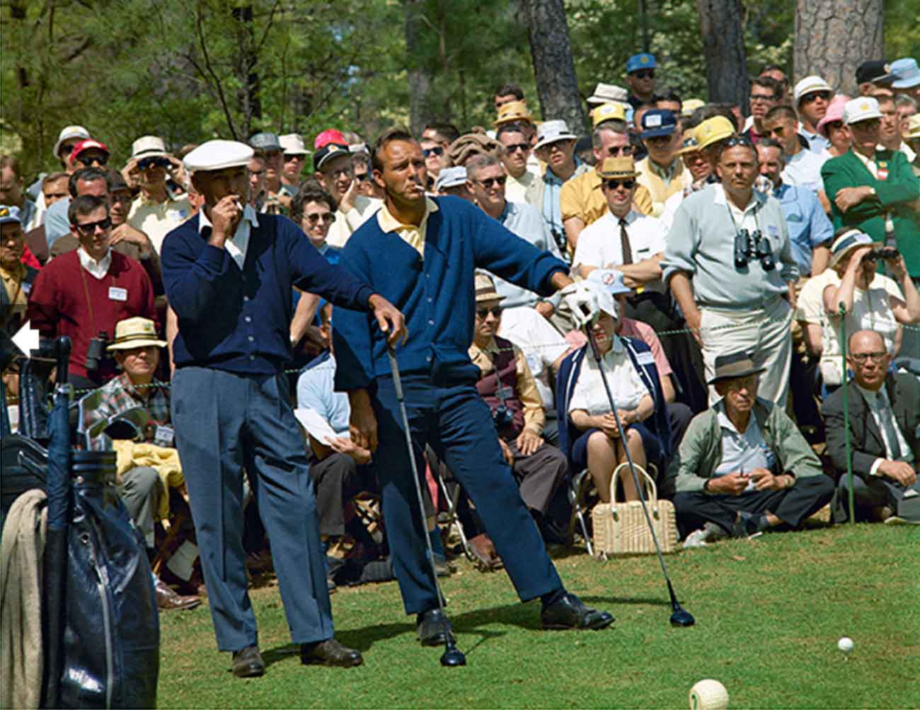 The iconic photograph of Hogan and Arnold Palmer waiting on the second hole during the third round of the 1966 Masters while smoking cigarettes. It’s the first time they played with each other in competition.Â