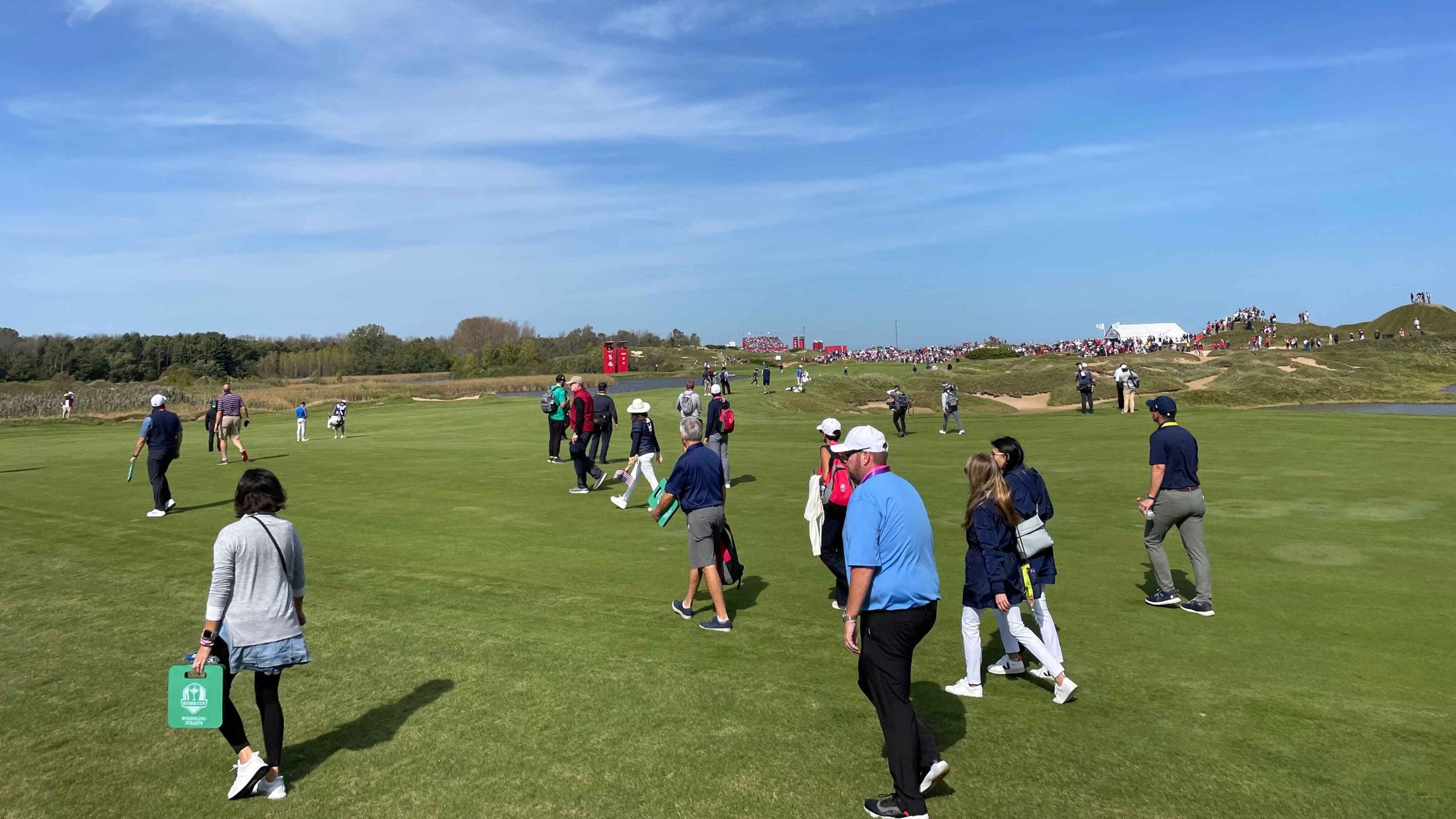 That’s not a knock on the Wisconsin fans, who have come out in star-spangled force this week. It’s an effect of the extraordinary piece of property upon which this 43rd Ryder Cup is being played: a dunesy, windy Pete Dye masterwork that extends along two miles of Lake Michigan. If you don’t watch your step, you can easily tumble into one of the nearly 1,000 bunkers that pepper the course, or slide down the slick fescue-lined mounds that flank every hole. All of this wild landscaping makes the Straits course difficult to navigate, both for fans and tournament organizers alike.