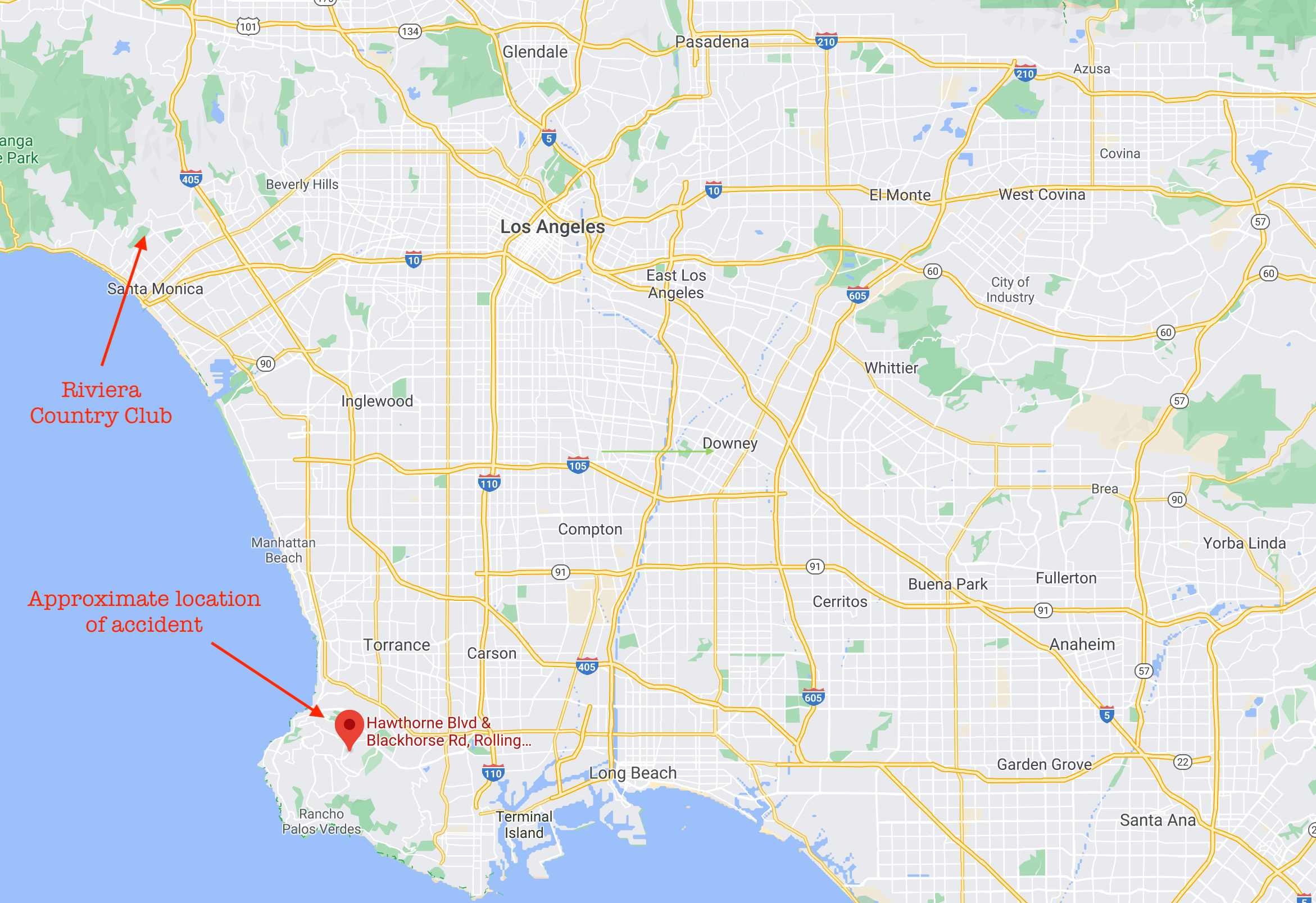 Golf Digest reported Woods was in Rancho Palos Verdes for a video shoot for the magazine and Golf TV, adding he “was in good spirits on Monday but did not arrive to the course for the second day of shooting.” Rancho Palos Verdes is a sprawling, affluent area about 30 miles south of L.A.’s downtown, much more noted for its horse farms and surfing beaches than its golf courses, although Trump L.A. is located in the city. The two-day shoot was taking place at Rolling Hills Country Club, where Woods was apparently giving lessons to celebrities, including comedian David Spade and former NBA star Dwyane Wade.