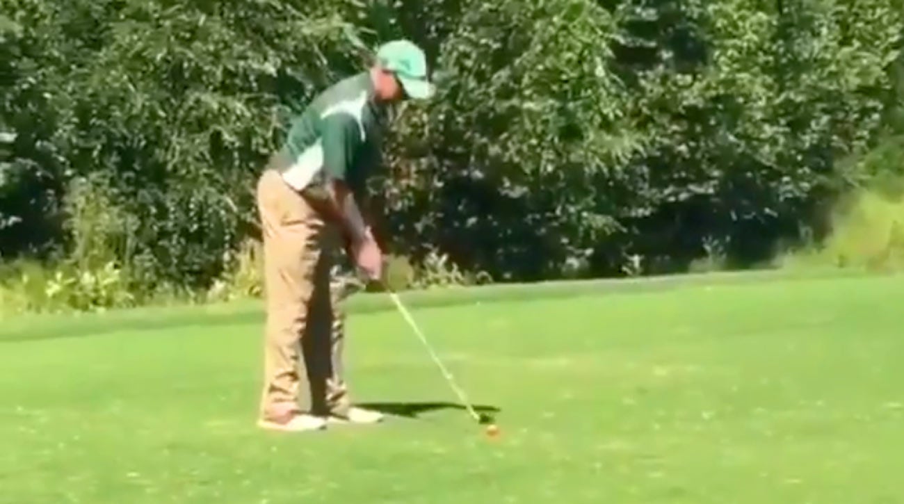 The clip in question lasts one minute. Incredibly, the golfer’s pre-shot routine takes up 52 seconds… and he was already twitching and waggling before the video began. The cameraman plays narrator and notes that it’s a 115-yard par-3, and that the man on the tee box is “possibly the worst golfer I’ve ever seen in my life.”