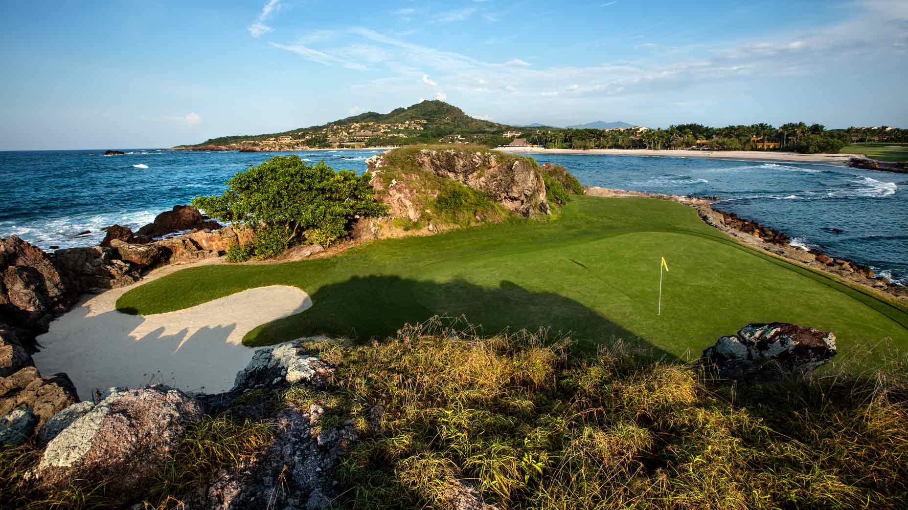 Listed as hole 3B on the Punta Mita Pacifico scorecard, the Tale of the Whale is an optional par-3 that plays to island green, set amid a natural black-rock formation, some 190-yards of the coast. If your tee shot finds dry land, getting to your ball takes a bit of time as it requires a ride on a motorized dinghy. But no worries. No one is in a rush. Located in what was once a sleepy fishing village, Punta Mita is all tropical tranquility, a sun-splashed resort course with wide, friendly fairways, swaying palm trees and ocean views. Max fee: $265 (Photo: Courtesy of Punta Mita)